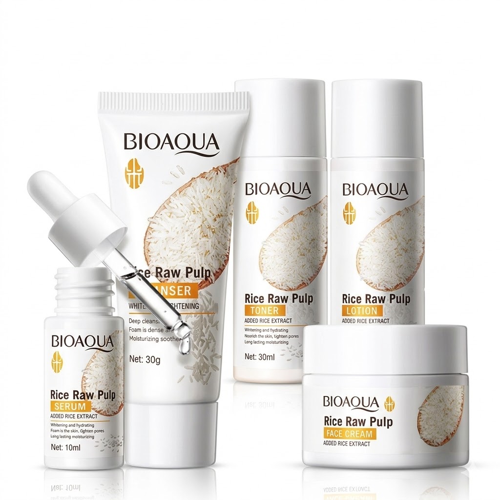 Este sistema de 5 peças não é apenas um conjunto de miniaturas; é um protocolo completo de Beauty Tech inspirado em tradições milenares asiáticas que aproveitam o poder nutritivo do arroz para transformar a pele de dentro para fora. Projetado para ser unissex e adequado para todos os tipos de pele, ele foca na tríade essencial: limpeza profunda, hidratação multicamadas e iluminação intensa.